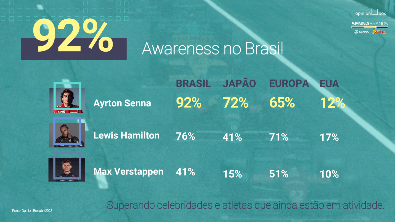 As pesquisas também revelaram que Ayrton não é apenas um nome forte no Brasil, onde 92% da população o reconhece, mas também é uma referência global nos esportes para 88% dos entrevistados no México, 79% na Europa e 59% no Japão, por exemplo.